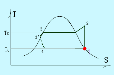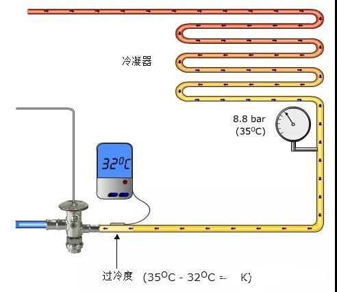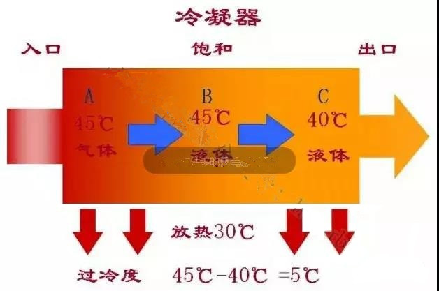 例如:以R22冷媒為例,假設(shè)冷凝器內(nèi)的壓力為1.64MPa,則飽和溫度為45℃。飽和狀態(tài)的A-B間為45℃,A-B間冷媒為氣液混合狀態(tài)(潛熱)。B-C間所有的氣體已經(jīng)變?yōu)橐后w,狀態(tài)為全液體狀態(tài),并且不斷向周圍散熱,使溫度繼續(xù)下降(顯然),譬如降至40℃ 。這時(shí)冷凝器出口溫度比冷凝器內(nèi)的溫度低5℃,這種狀態(tài)稱為過冷,我們稱這時(shí)流出的冷媒有5℃的過冷度。