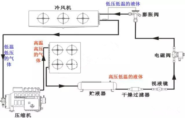4、經(jīng)過熱力膨脹閥的節(jié)流降壓變成低壓低溫的制冷劑液體后流入蒸發(fā)器(冷風(fēng)機(jī)或盤管);