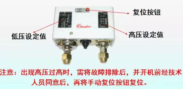 控制高低壓壓力,當(dāng)排氣壓力過高或吸氣壓力過低時,控制器立即動作切斷壓控控制線路,使壓縮機(jī)停車。