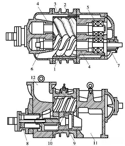 1—陽(yáng)轉(zhuǎn)子;2—陰轉(zhuǎn)子;3—機(jī)體;4—滑動(dòng)軸承;5—止推軸承;6—平衡活塞;7—軸封;8—能量調(diào)節(jié)活塞;9—卸載滑閥;10—排氣口;11—進(jìn)氣口