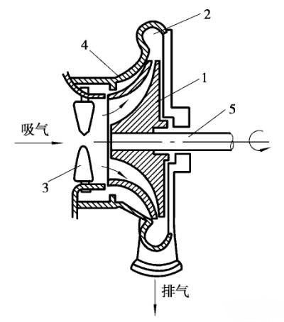 1—葉輪;2—擴(kuò)壓器;3—導(dǎo)流葉片;4—機(jī)體;5—主軸