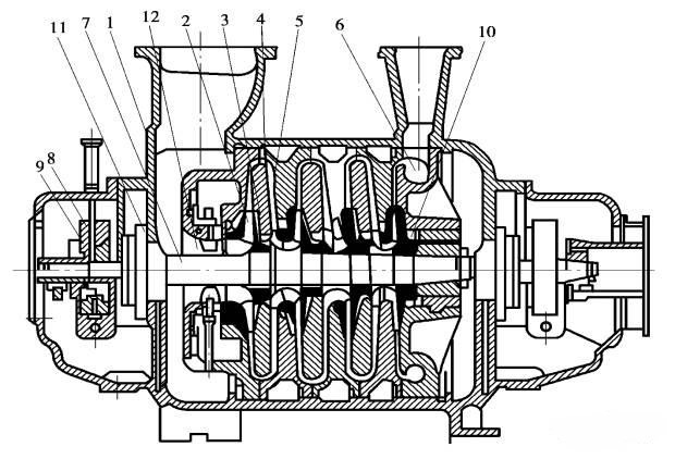 —機(jī)體;2—葉輪;3—擴(kuò)壓器;4—彎道;5—回流器;6—蝸殼;7—主軸;8—軸承;9—推力軸承;10—密封;11—軸封;12—進(jìn)口導(dǎo)流裝置