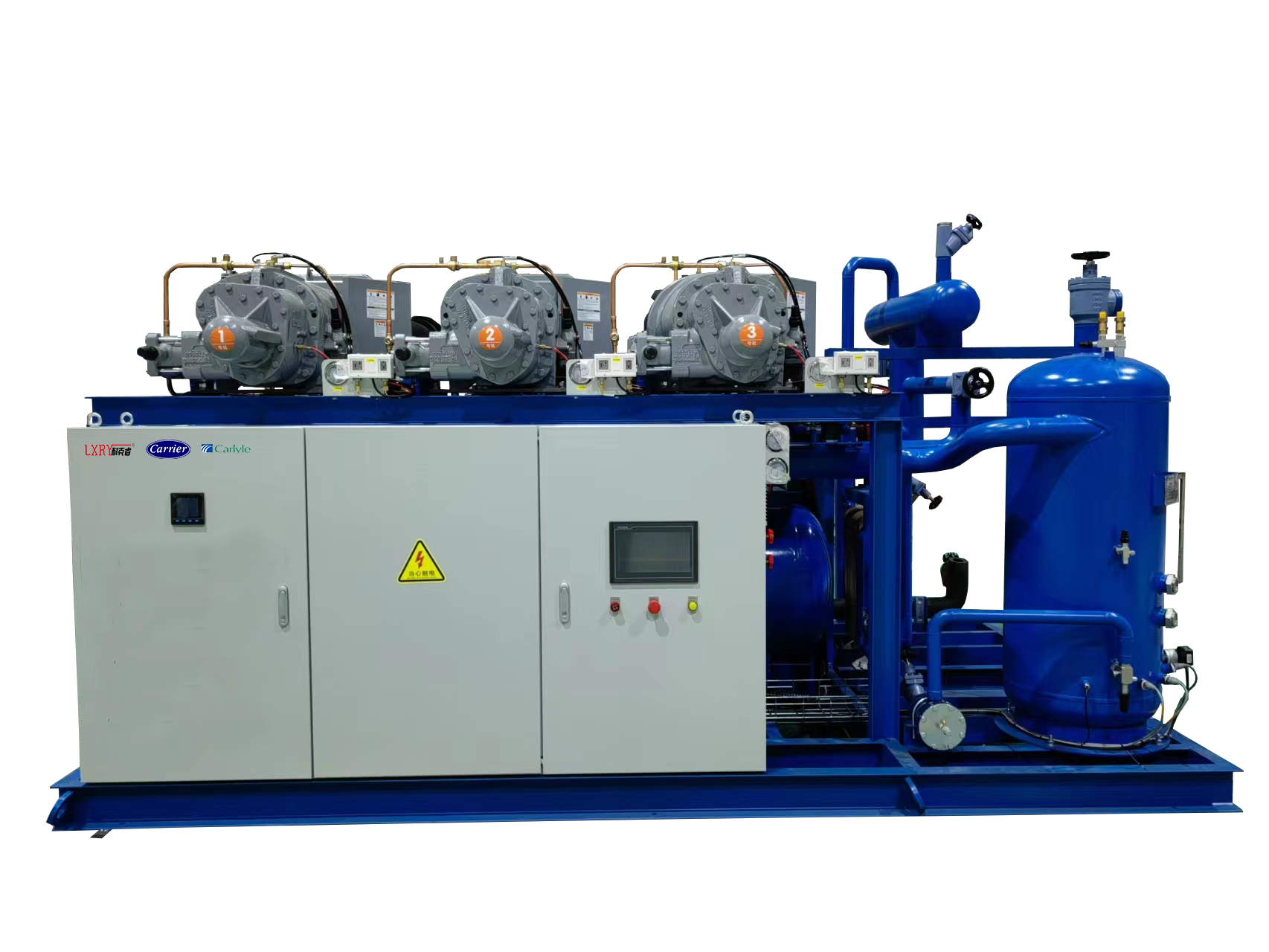 在正式開機(jī)前,請?jiān)俅_認(rèn)以上內(nèi)容:1、按啟動壓縮機(jī)按鈕,這時冷卻水泵就會啟動運(yùn)行,請及時檢查冷卻水泵的運(yùn)行電壓及運(yùn)行啟動電流是否正常,緊接著請查看冷卻水泵的進(jìn)出口壓力是否正常。供液電磁閥是否打開,R22液體通過熱力膨脹閥向系統(tǒng)內(nèi)蒸發(fā)器供液,幾秒種后吸氣壓力回升到一定值后,壓縮機(jī)會發(fā)出一種運(yùn)動聲,壓縮機(jī)啟動了,其壓縮機(jī)啟動電流是電動機(jī)額定電流的2倍,瞬間就轉(zhuǎn)為正常的壓縮機(jī)電機(jī)的額定電流。2、當(dāng)壓縮機(jī)正常運(yùn)行時壓縮機(jī)油加熱器就停止運(yùn)行了,電加熱器指示燈就會熄滅。3、當(dāng)壓縮機(jī)運(yùn)行后,庫房內(nèi)的盤管或冷風(fēng)機(jī)就會運(yùn)轉(zhuǎn)起來,開始降溫。4、當(dāng)冷卻水溫達(dá)到25℃,浩洋冷凍提示:此處看設(shè)定溫度哦,冷卻塔風(fēng)機(jī)就會自動開啟運(yùn)行,強(qiáng)迫空氣對流來降低冷卻水的溫度,這時操作者需要確定風(fēng)機(jī)的運(yùn)行電壓,運(yùn)行電流和風(fēng)機(jī)運(yùn)行聲音是否正常。5、當(dāng)壓縮機(jī)完全運(yùn)行時,就需要確認(rèn)運(yùn)行電壓、運(yùn)行電流、壓縮機(jī)運(yùn)行聲音。浩洋冷凍提示:全自動機(jī)組剛開始時是運(yùn)行一臺壓縮機(jī)的。當(dāng)壓縮機(jī)制冷量不能滿足外部能量時CPU就發(fā)出啟動第二臺壓縮機(jī)的指令,來達(dá)到雙機(jī)運(yùn)行的目的。6、如果機(jī)器是雙機(jī)頭的制冷壓縮機(jī)組,在剛開始運(yùn)行時是啟動一臺壓縮機(jī)的,當(dāng)電腦板上的溫度傳感器檢測到溫度曲線沒有降溫驅(qū)使時,電腦就驅(qū)動第二臺壓縮機(jī)啟動運(yùn)行。當(dāng)制冷系統(tǒng)溫度達(dá)到設(shè)定要求時,CPU 就卸載一臺壓縮機(jī)運(yùn)行,當(dāng)庫房溫度完全達(dá)到設(shè)定溫度時,CPU 就命令第一臺壓縮機(jī)停止工作,并處于待機(jī)狀態(tài)。當(dāng)?shù)诙€運(yùn)行溫度高與房間設(shè)定溫度時,CPU就先啟動第一臺壓縮機(jī)開始運(yùn)行工作。